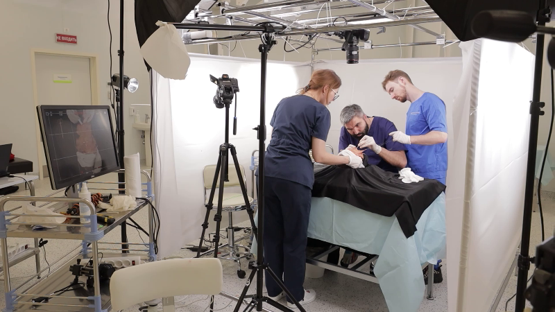 Первой частью была работа с кадаверным материалом. Кадаверный материал был доставлен из США. Уникальным составом мы провели окраску сосудов для их детальной визуализации. Во время нативной диссекции проведено выделение важных анатомических структур. Показаны инъекции на материале с дельнейшим анатомическим разбором.